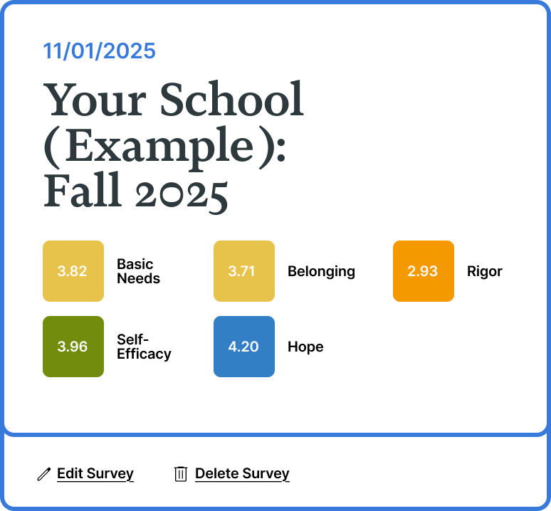 Our signature student survey helps assess differences in how students experience school and whether they feel safe, included, hopeful, and engaged.